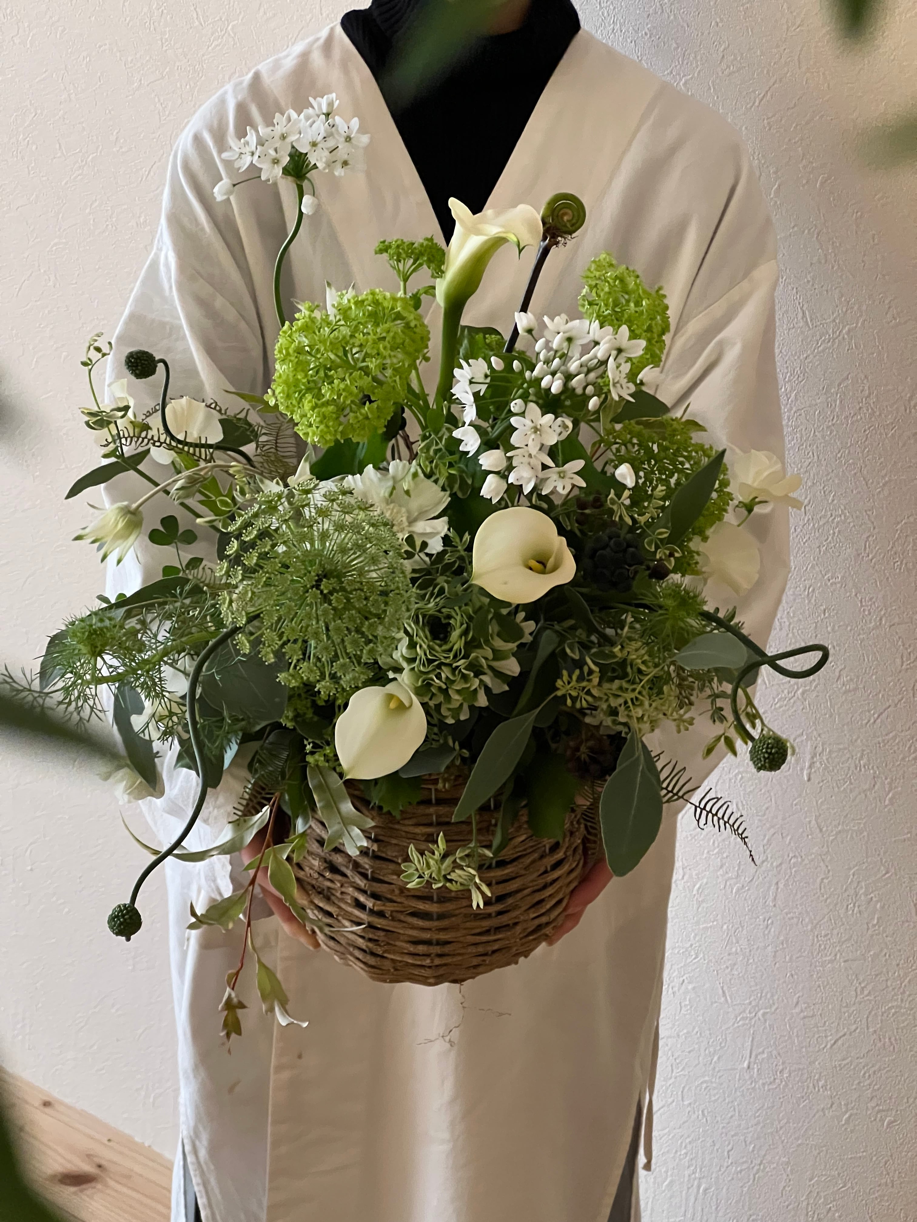※ 細かい花材の指定はお断りしていますが 「 淡い色味で 」「 濃い赤で 」などご希望がございましたら備考欄にてお知らせください。記載がない場合は「 完全おまかせ 」となります。